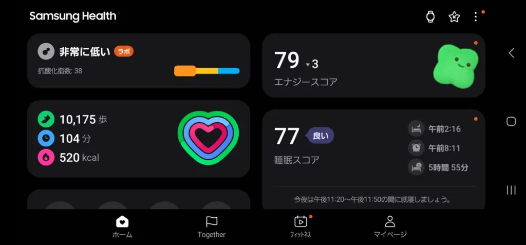 その他、睡眠スコアやエナジースコアなど各種機能を取り揃えています。エナジースコアなんかは、日々の自分の身体の総合スコアとして結構に気にしながら日常生活を送っています(笑)