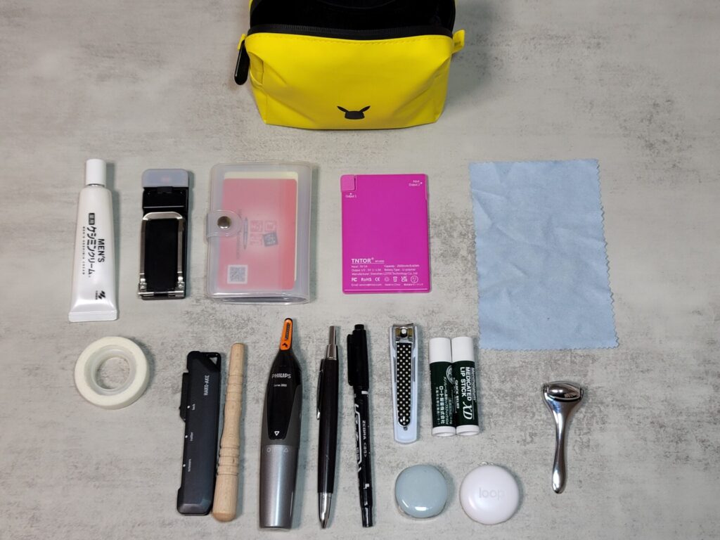 ​私自身、購入して最初の3ヶ月ほどは、このポーチを毎日リュックに入れて持ち運んでいました。しかし、日々の荷物を見直していく中で「毎日の通勤にこれだけの容量は必要ないかもしれない」と思ってしまい、結局、持ち運び用はもっと薄型で最小限のものが入る小さいケースに移行することになりました。