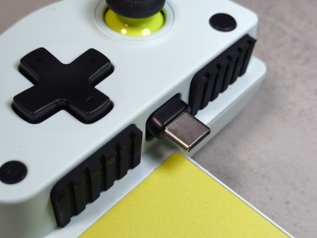 このコントローラーにはバッテリーが内蔵されていません。スマホのType-C端子に直挿しして、スマホから給電するタイプです。ちなみにコントローラにもType-C端子があるので、これでスマホが充電できるらしいですが、私のスマホでは反応しませんでした。